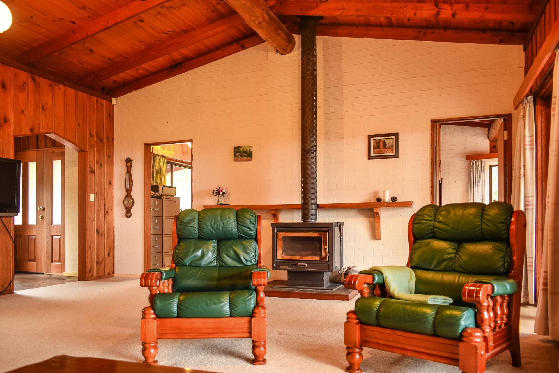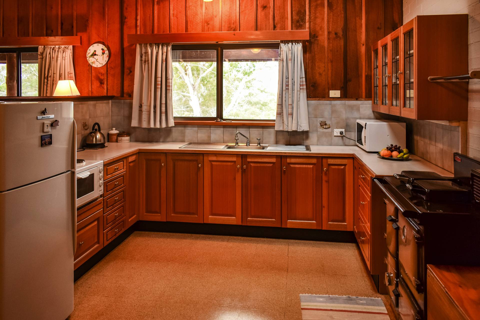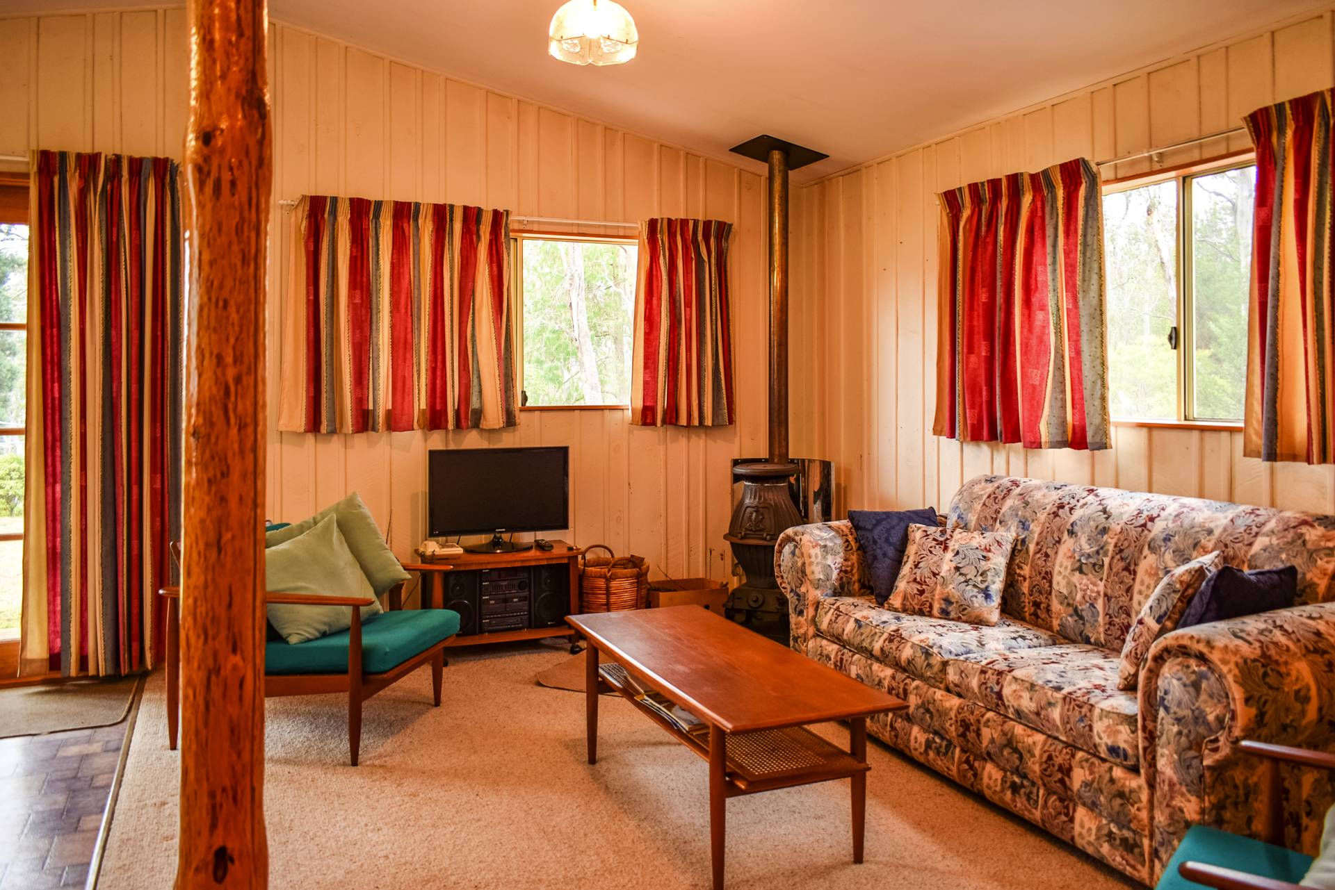 The home has a timber kitchen with electric cook top and timber fuelled Rayburn slow combustion stove. The stove warms the home as well as hot water in winter months. A slow combustion wood heater at the opposing end of the living area amply contributes to heating also. The home includes a bathroom, ensuite and store with all services including electric hot water, bottled gas (for extra heating) and large underground 20,000 gal. concrete rainwater tank. Additional 2400 gal. poly tanks collect water from the cement floor large double workshop and garage give the home and cottage an extra large water capacity.