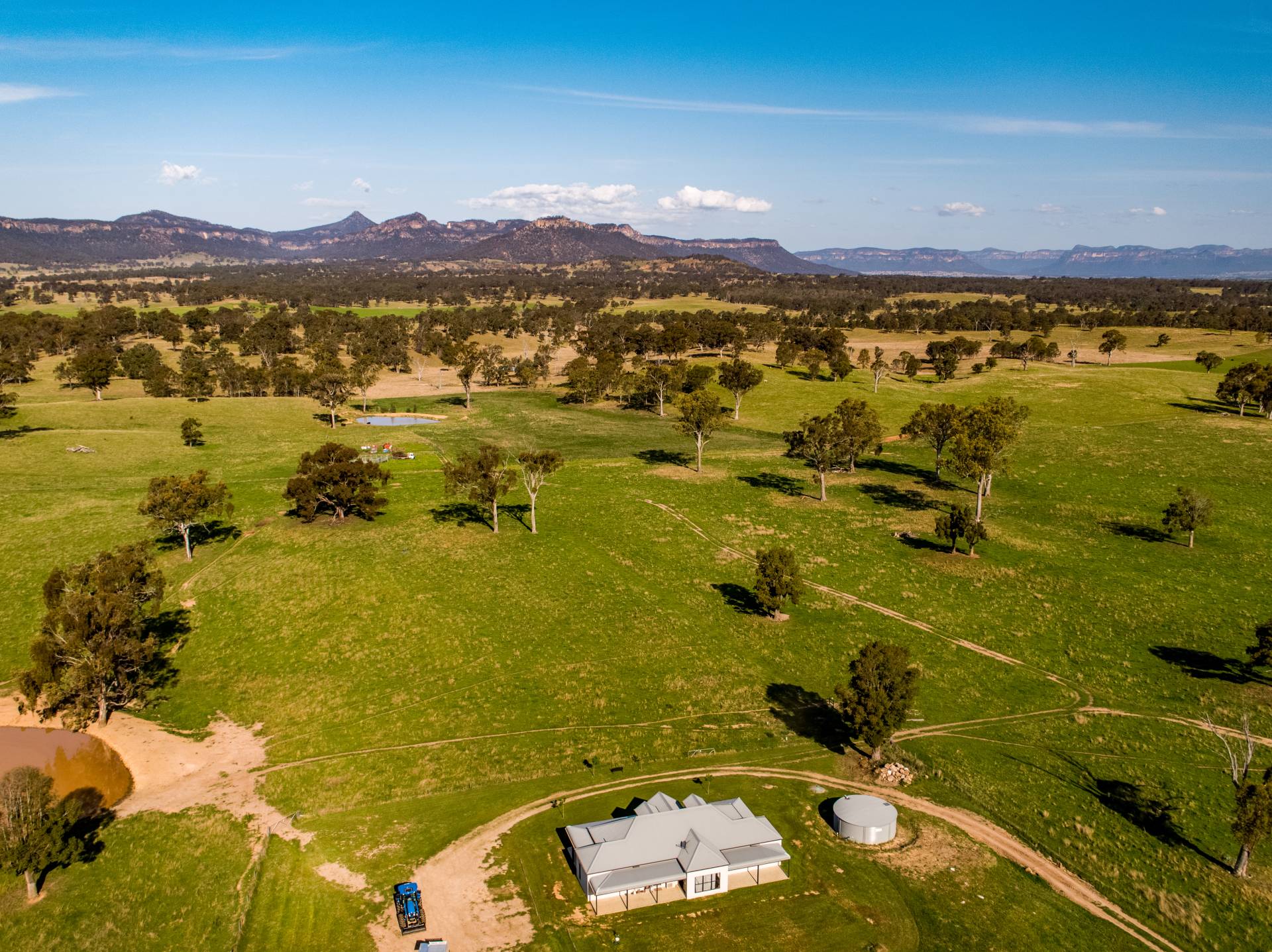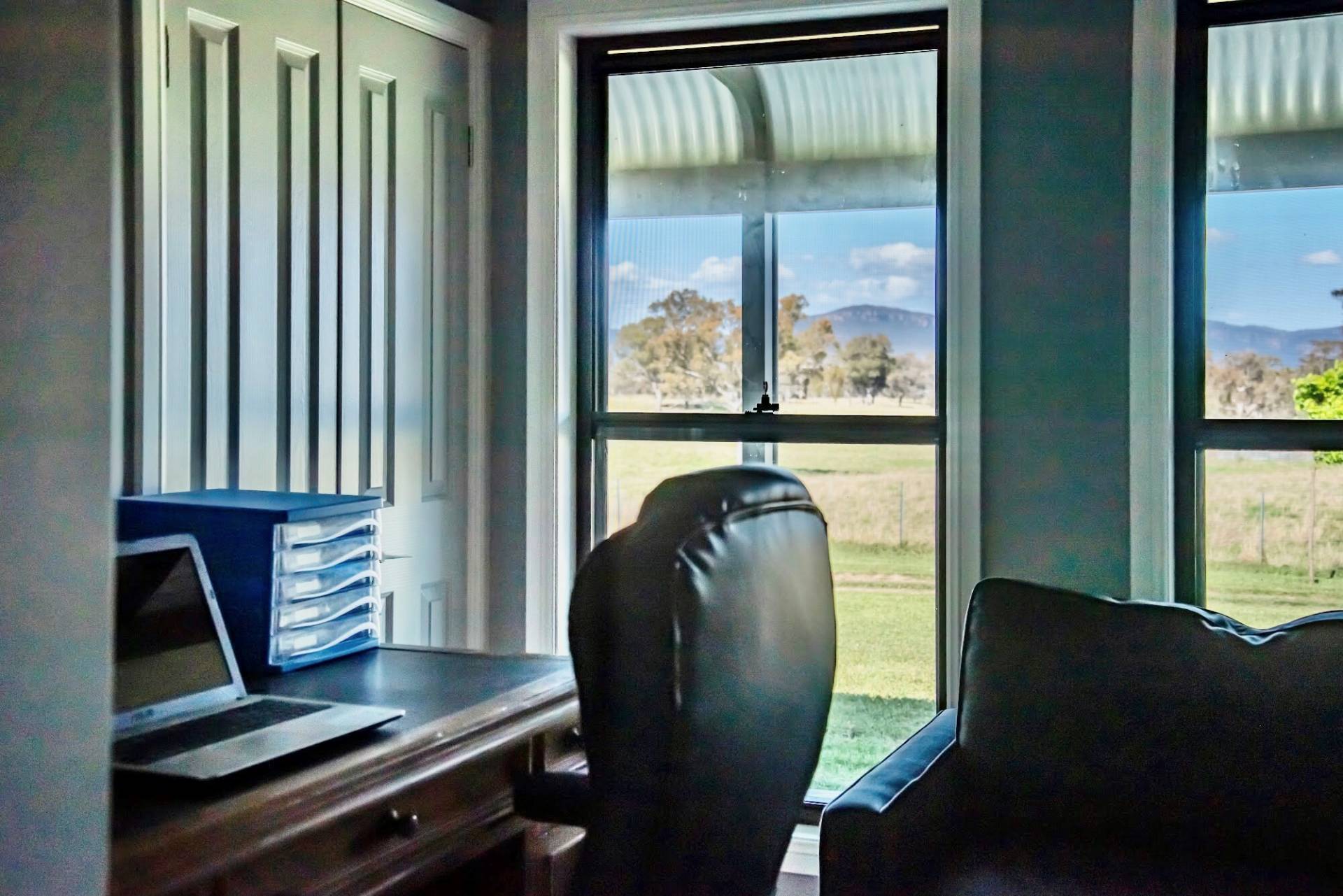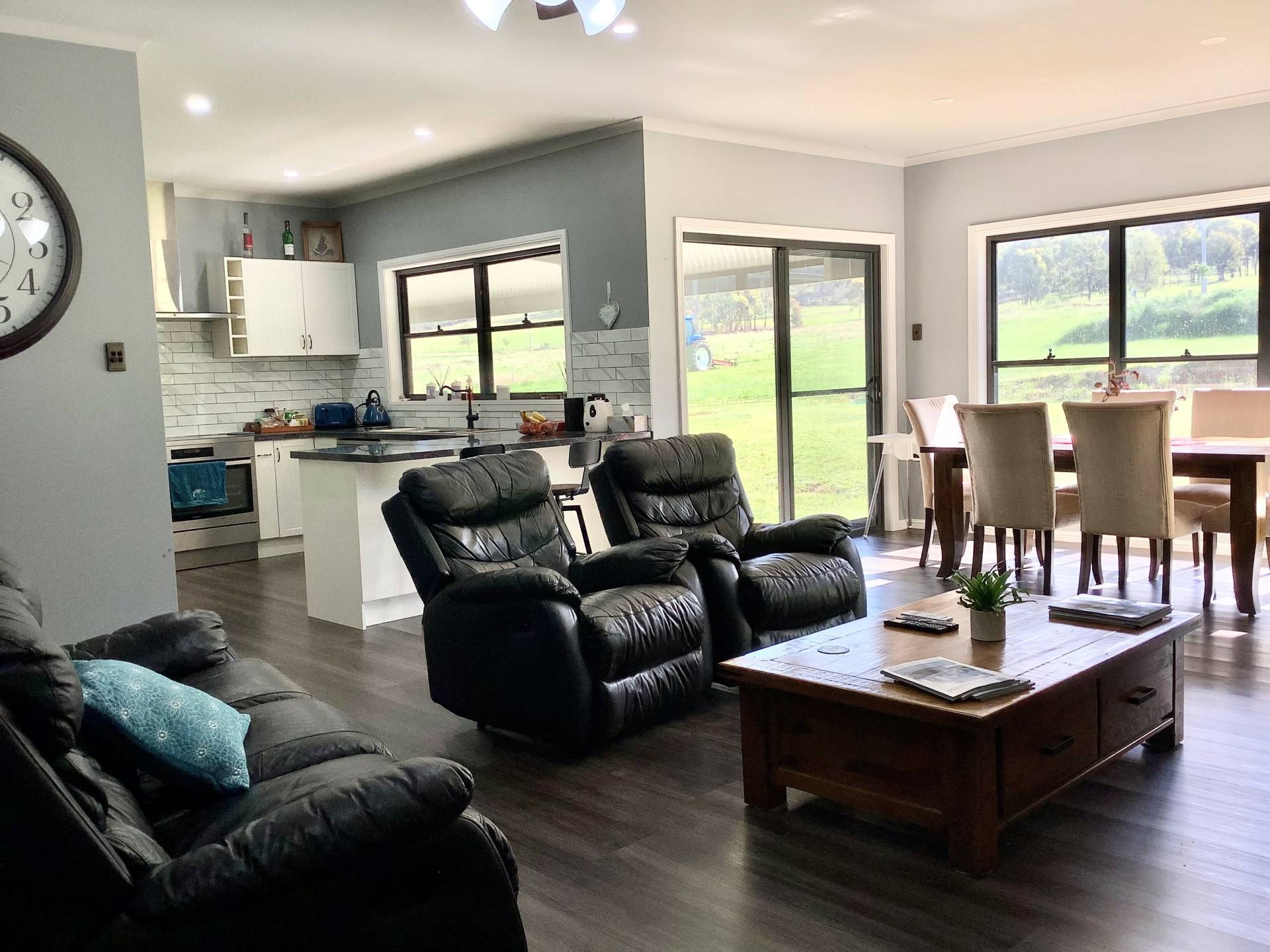 The modern kitchen and dining look out over the surrounding landscape through large glass windows and sliding doors. Wrap around verandahs allow for under cover dining or relaxation highlighting the view of the surrounding rural vista of grazing land and mountain escarpment backdrops of the Capertee Valley.