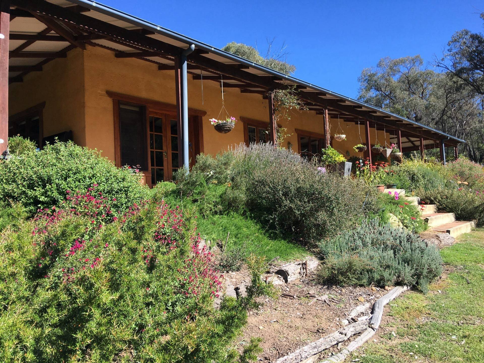 An absolutely beautiful handmade, poured earth house (featured in Owner Builder Magazine April/May 2010) oozes character throughout. Poured earth is thermally dense and, as the house was built to face due north, it collects the winter sun, while the large verandah and louvre windows provide cool air in summer. This means the house remains very cool on the hottest summer day, without air conditioning, and is cosy warm throughout winter with its brand new slow combustion wood heater.